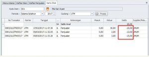 Seperti contoh gambar dibawah menunjukan adanya saldo minus pada kartu stok.